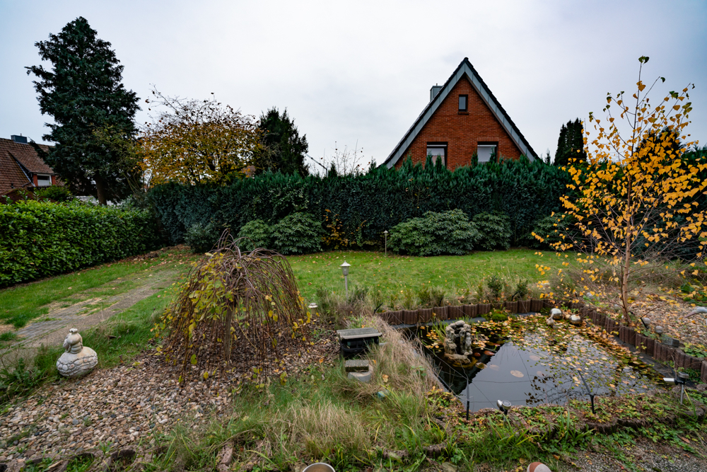 Im Garten mit Südausrichtung findet man zum einen eine Terrasse direkt am Haus vor und einen kleinen, schönen Zierteich.
