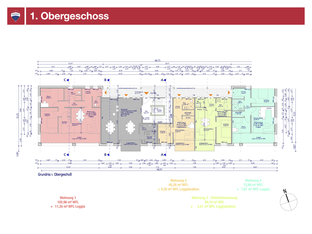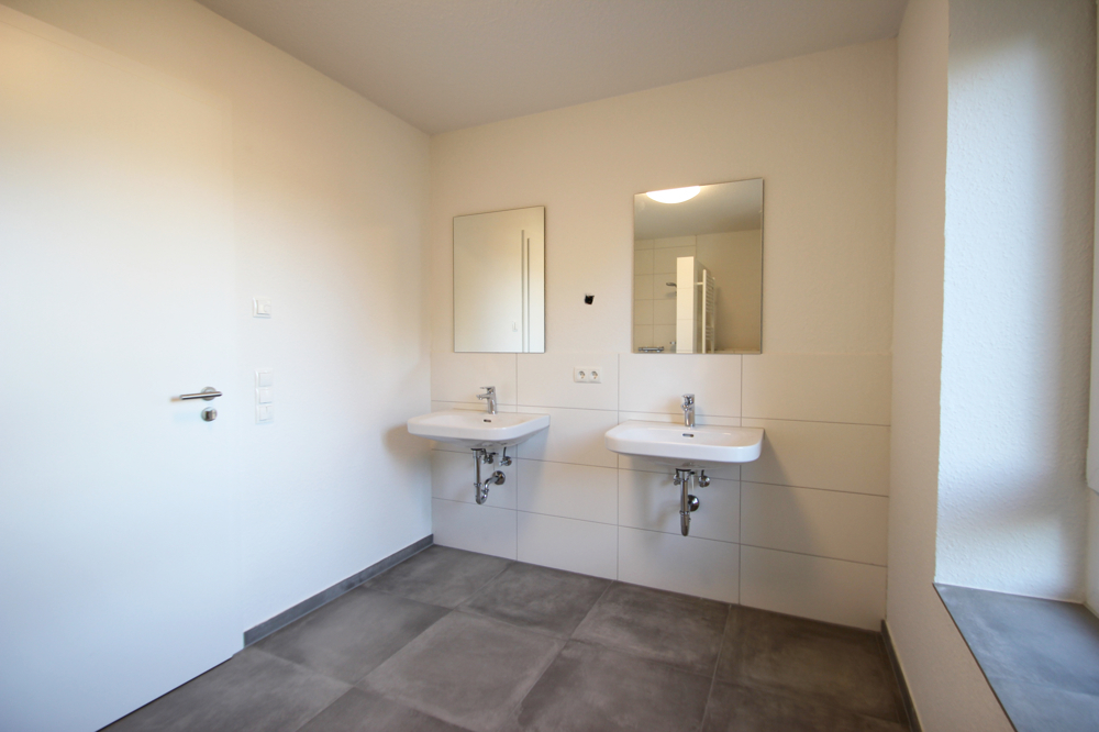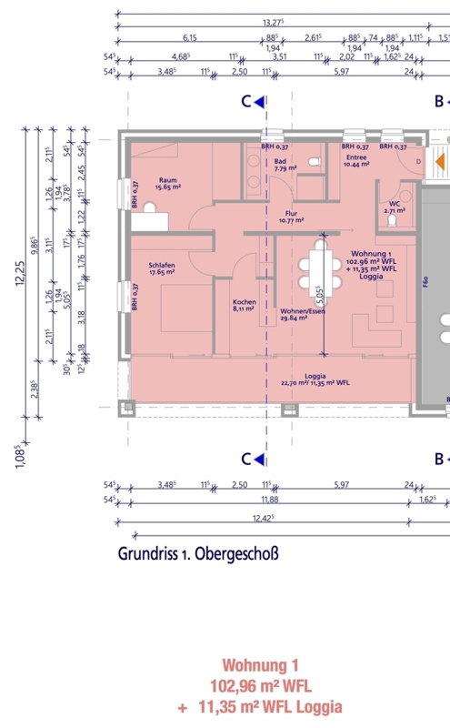 Mit ca. 114 m² Wohnfläche bietet diese exklusive Wohnung Platz für ein bis vier Personen. Die Raumaufteilung gestaltet sich sehr gelungen. Man gelangt durch die Haupteingangstür in das gemeinschaftliche Treppenhaus mit einem Personenaufzug. Über die/ den Treppen/Aufzug erreicht man das 1. Obergeschoss. Über einen Laubengang gelangt man zur Eingangstür der Wohnung. In der Wohnung befindet sich das helle Entree mit 10,44 m² Fläche und geht in den Flur über. Diese Wohnung 1 verfügt über ein geräumiges Tageslicht-Badezimmer mit Doppelwaschtisch, ebenerdiger Dusche, Handtuchheizkörper und WC, sowie ein separates Gäste-WC. Zur Wohnung gehören zwei Schlafzimmer, wovon ein Schlafzimmer einen Zugang zur großen Loggia besitzt. Der Wohn- und Essbereich verfügt ebenfalls über große Fensterelemente mit direktem Zugang zur Loggia mit Süd-Lage.