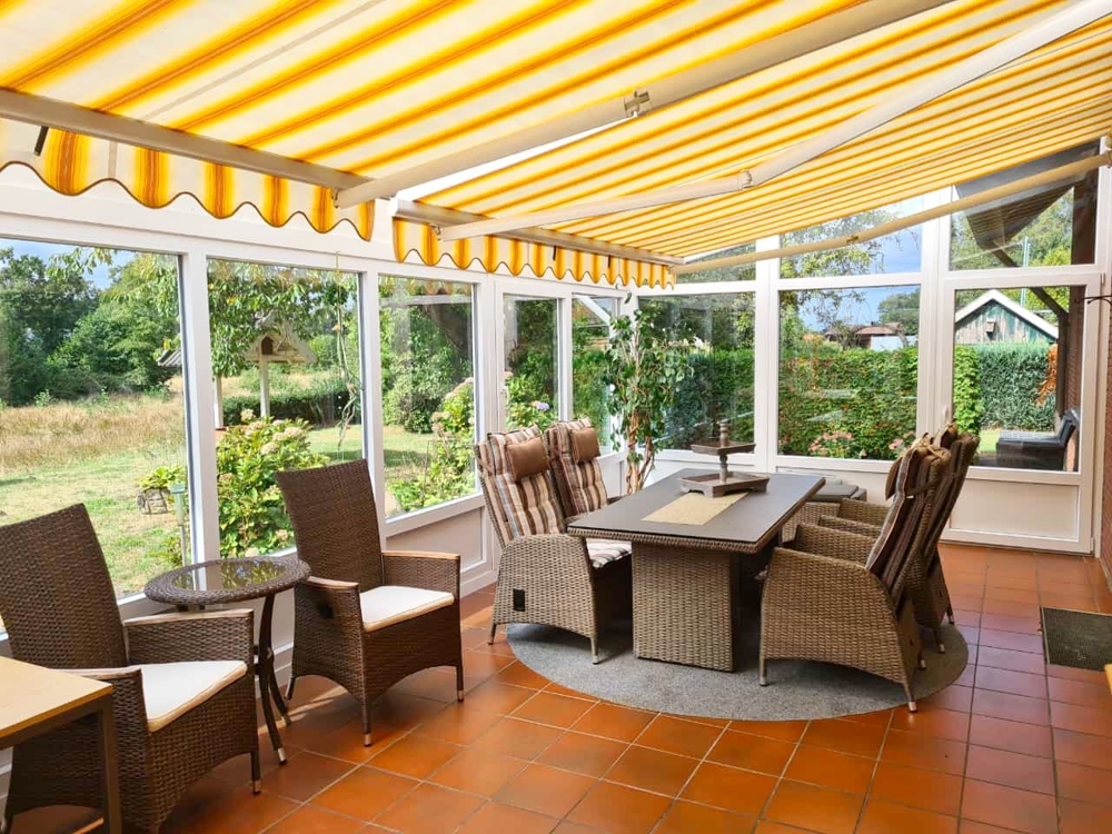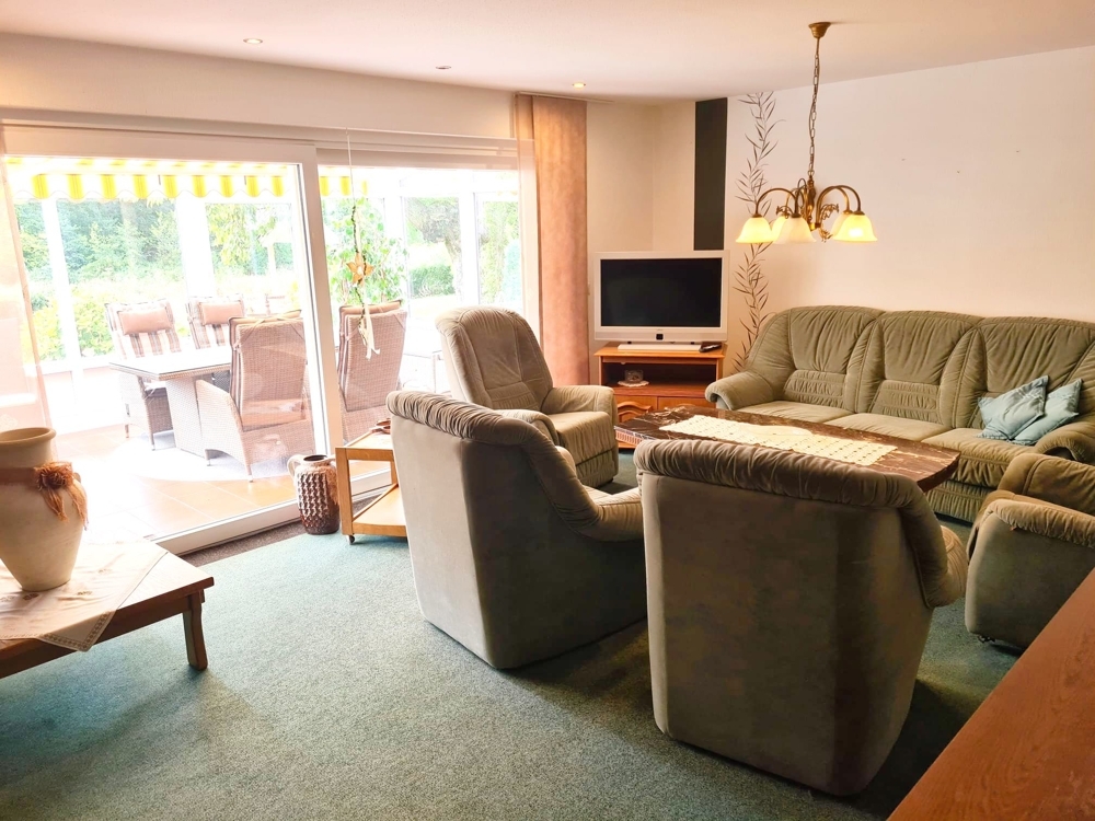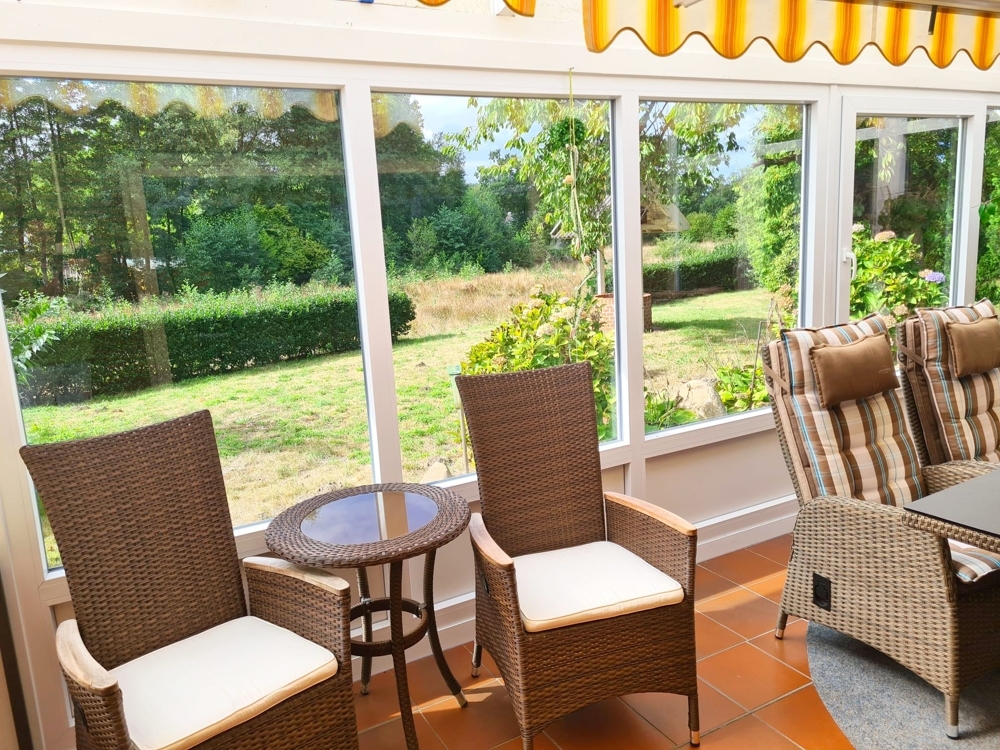Der lichtdurchflutete Wintergarten mit großen Fensterfronten bietet den perfekten Platz zum Entspannen mit Blick in den liebevoll angelegten und gepflegten Garten mit großer Rasenfläche.