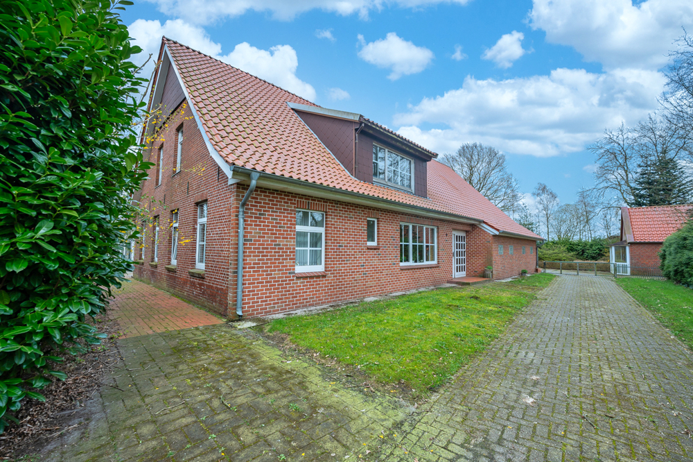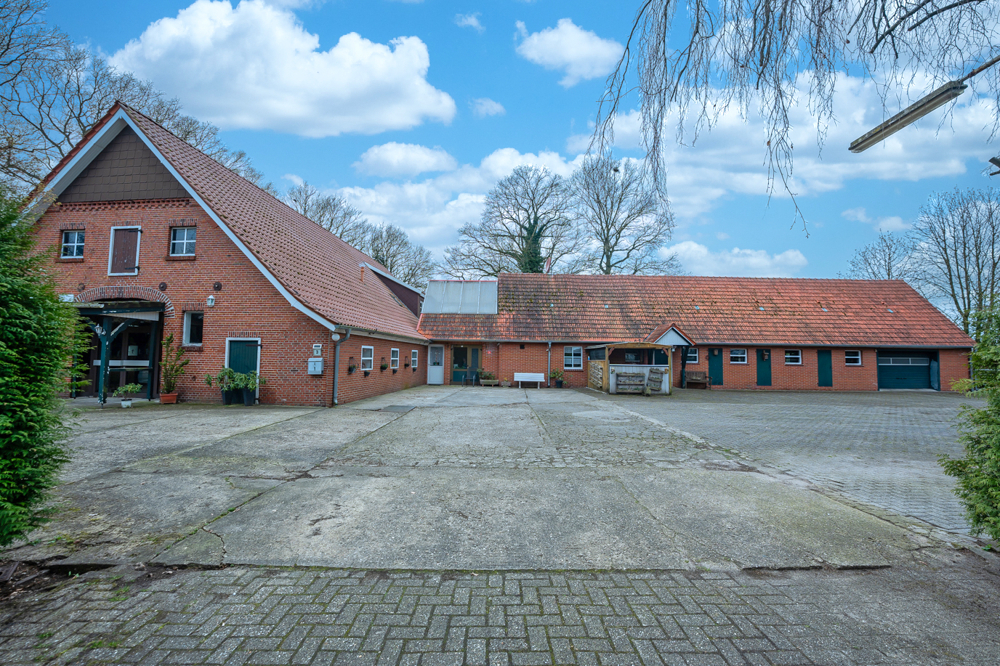 Attraktiver Resthof in ruhiger Alleinlage von Getelomoor: Dieses charmante Anwesen bietet eine einzigartige Gelegenheit auf ca. 199 m² Wohnfläche mit weiteren Möglichkeiten, ländliches Leben in idyllischer Umgebung zu genießen. Das Wohnhaus ist in zwei separate Einheiten mit eigenen Eingängen unterteilt. Eine geräumige, derzeit bewohnte Wohnung im Erdgeschoss verfügt über drei Zimmer, während sich im Obergeschoss eine weitere, derzeit leerstehende Wohnung mit drei Zimmern befindet. Angrenzend an das Wohnhaus befindet sich eine großzügige Diele, die früher eine Gewerbegenehmigung hatte. Ebenfalls in der Nähe liegt ein geräumiger, länglicher Lagerraum mit Garage, der früher als Schweinestall diente.Zu den Nebengebäuden gehören eine Garage, ein Gebäude mit zwei Pferdeboxen sowie eine Lagerhalle, die in drei Abteile unterteilt ist und alle freitragend mit einer Höhe von 6 Metern errichtet wurde. Auf einem separaten Flurstück befindet sich außerdem eine Scheune mit einer Höhe von 5 Metern.