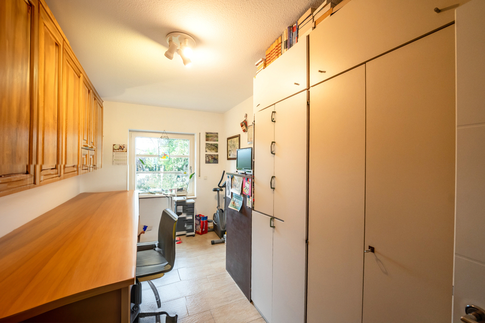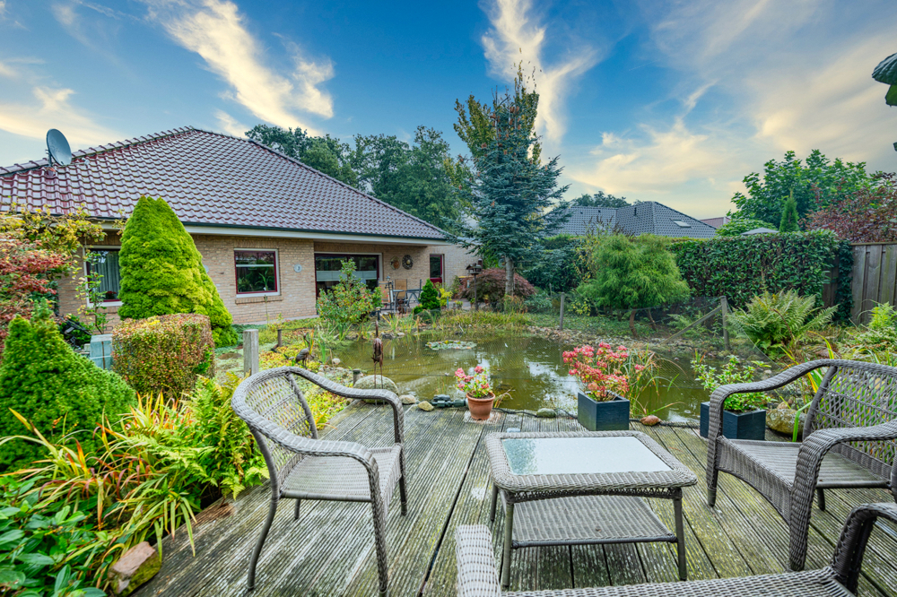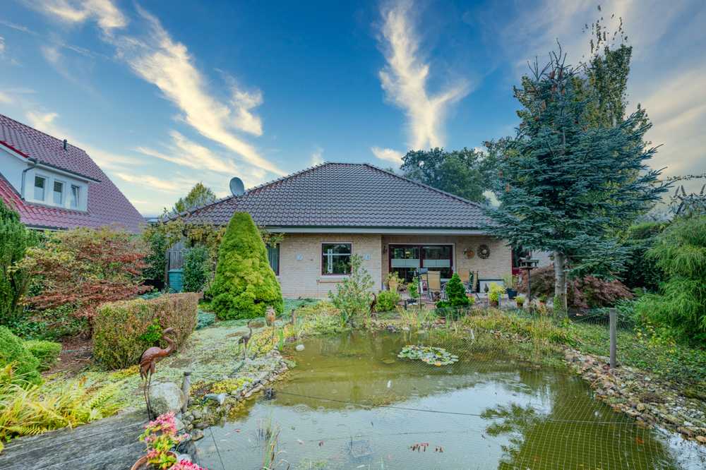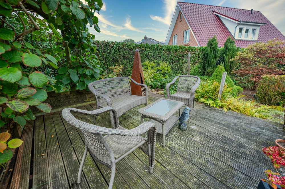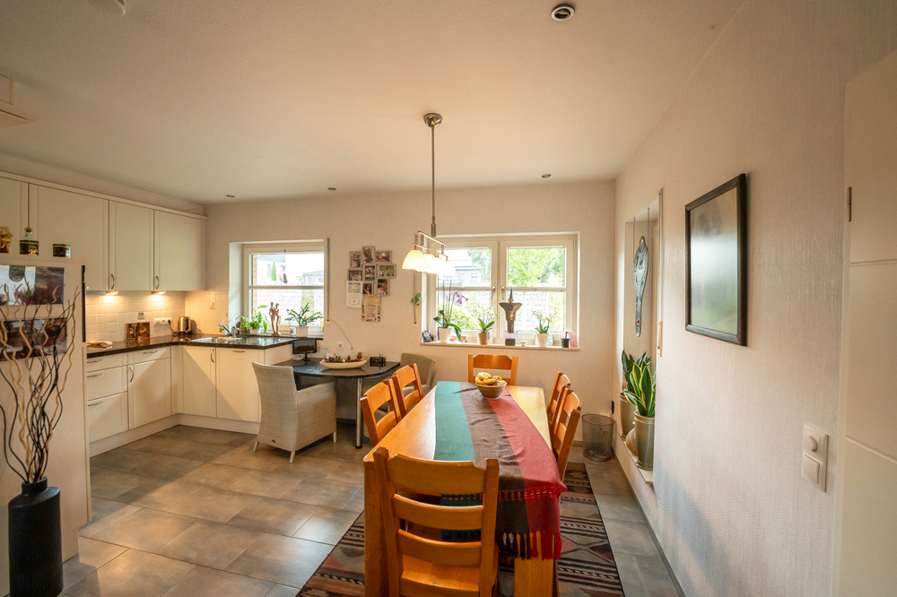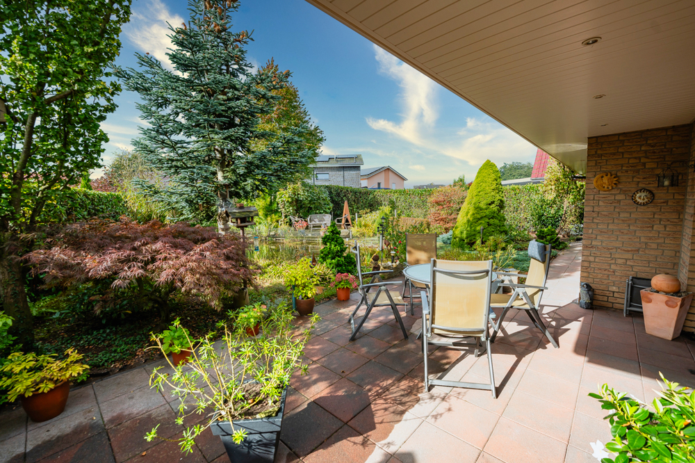 Die offene Raumgestaltung ermöglicht einen herrlichen Blick in den liebevoll angelegten Garten, der zum Entspannen einlädt. Eine großzügige Terrasse bietet den perfekten Ort für gemütliche Stunden im Freien. Zusätzlichen Komfort bieten der geräumige Hauswirtschaftsraum mit direktem Zugang zum Werkraum sowie zum Garten und Carport. Das Haus ist komplett ebenerdig und damit barrierefrei.