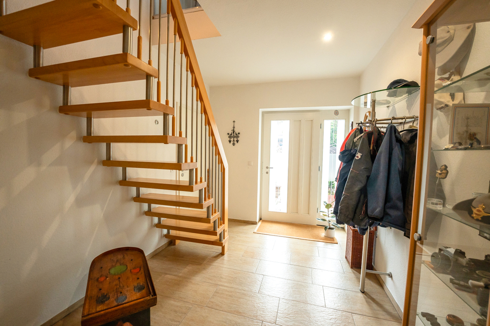 Die zentrale Lage ermöglicht es, alle wichtigen Ziele bequem mit dem Fahrrad zu erreichen. Das Stadtzentrum ist nur einen kurzen Weg entfernt. Im Erdgeschoss sorgt eine moderne Fußbodenheizung für angenehme Wärme, die sich optimal für die Kombination mit einer Photovoltaikanlage eignet. Das bis in die Dachspitze ausgebaute Obergeschoss bietet zusätzlichen Raum für vielseitige Nutzungsmöglichkeiten. Abgerundet wird das Angebot durch ein Doppelcarport mit ausreichend Stellfläche für Fahrzeuge sowie eine moderne Glasfaserverbindung, die blitzschnelles Internet garantiert.