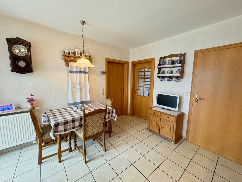 Im Erdgeschoss führt der Weg vom Eingangsbereich zunächst in das Gäste-WC und die separate Küche. Von hier aus gelangen Sie in den praktischen Hauswirtschaftsraum, der auch einen direkten Zugang zur Garage bietet. Ebenfalls vom Flur zu erreichen ist der großzügige Wohn- und Essbereich.
